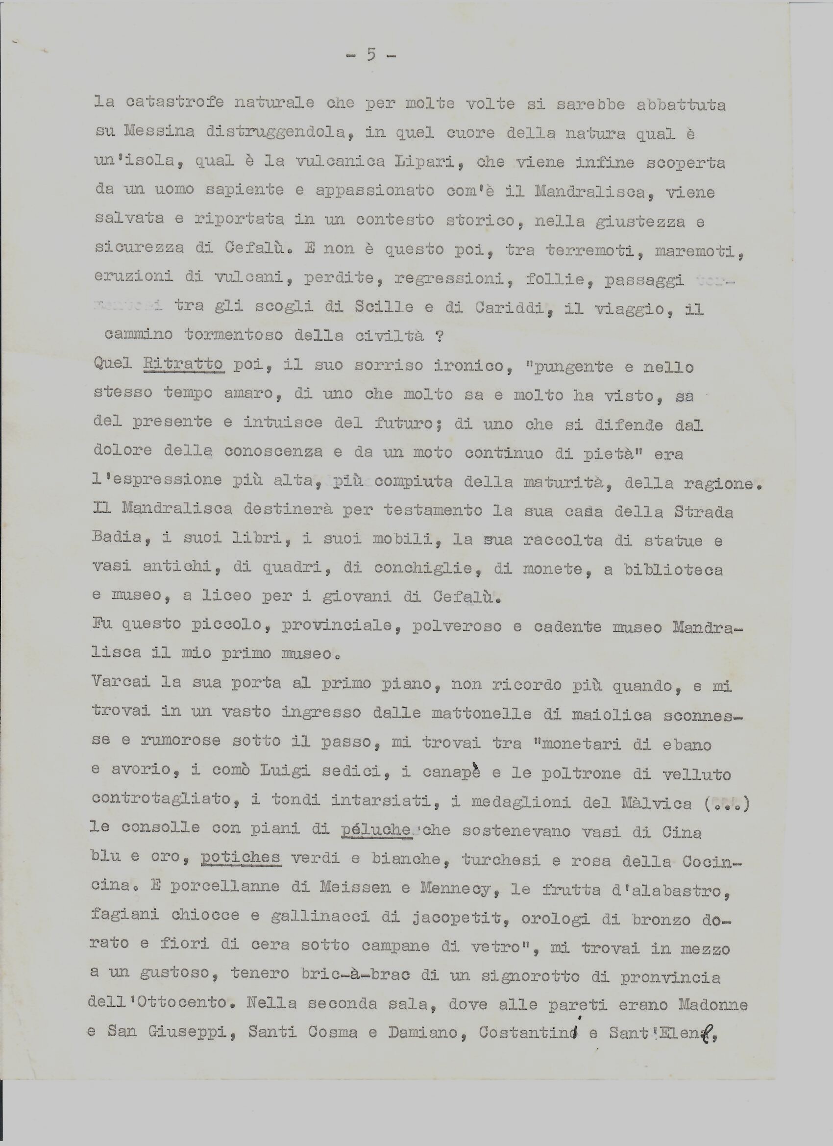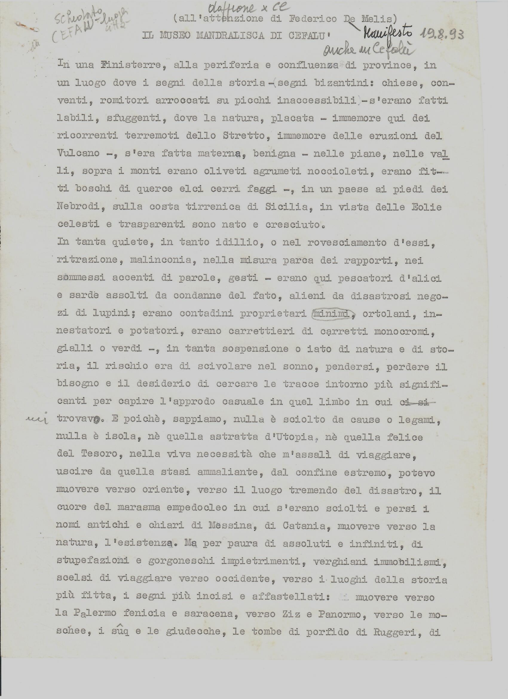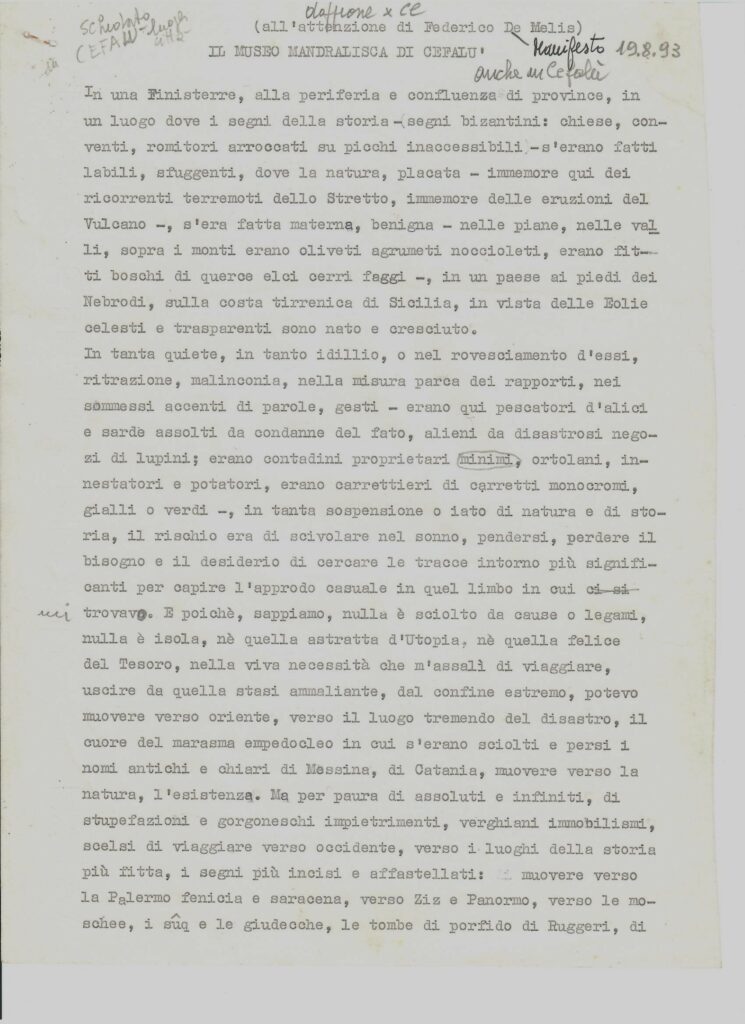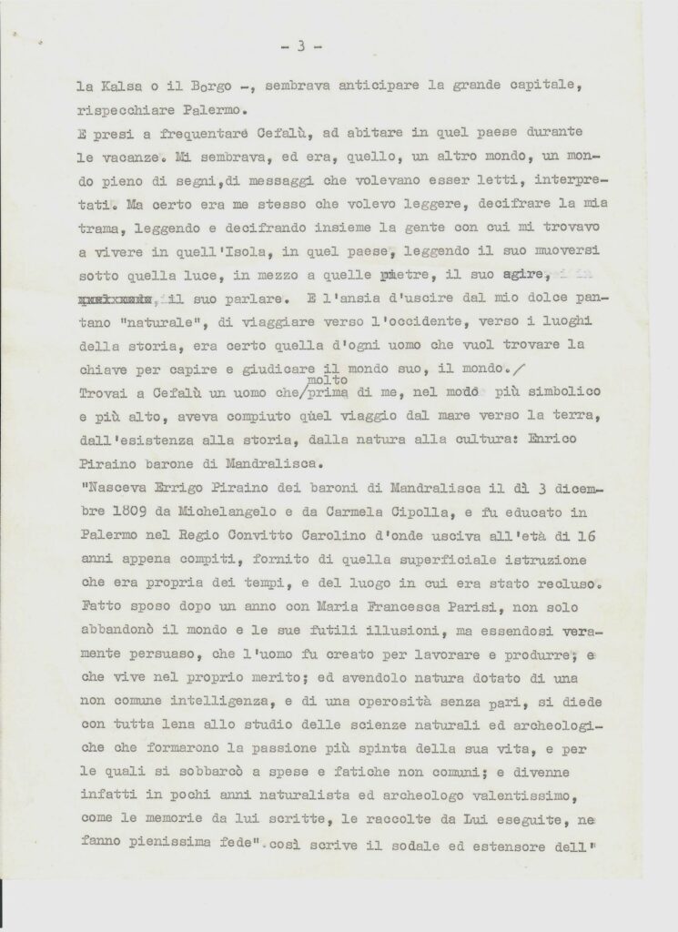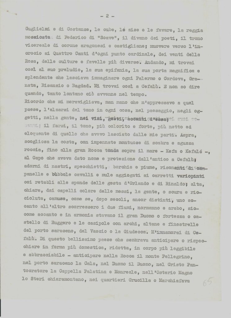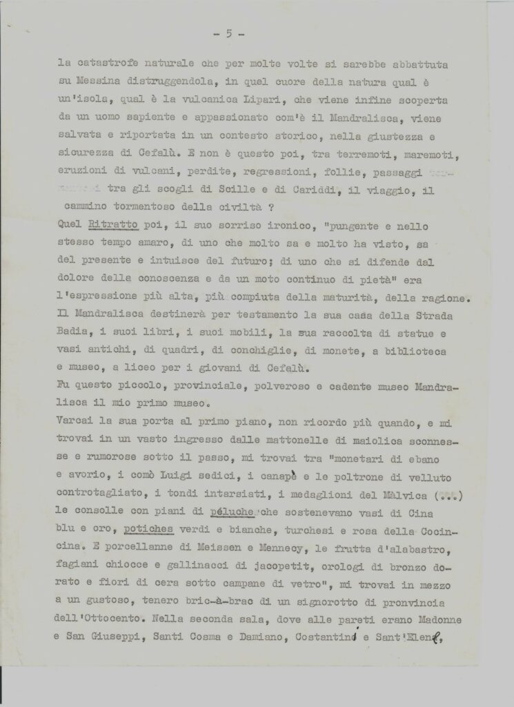 In cui, una volta giuntovi, come in una iniziazione misterica o una discesa agli Inferi, gli saranno rivelati, fuori di sè e dentro di sè, veramente dei prodigi. Come il prodigio del tempio di Segesta o quello, rovesciato e contrario, di Villa Palagonia, o quello “naturale” del’ Etna, o, infine, il prodigio di vedersi, in Sicilia, al di là d’ogni particolare contingenza, cadere dagli occhi ogni benda, di sopportare la realtà nella misura più alta in cui erano arrivati a sopportarla i Greci.