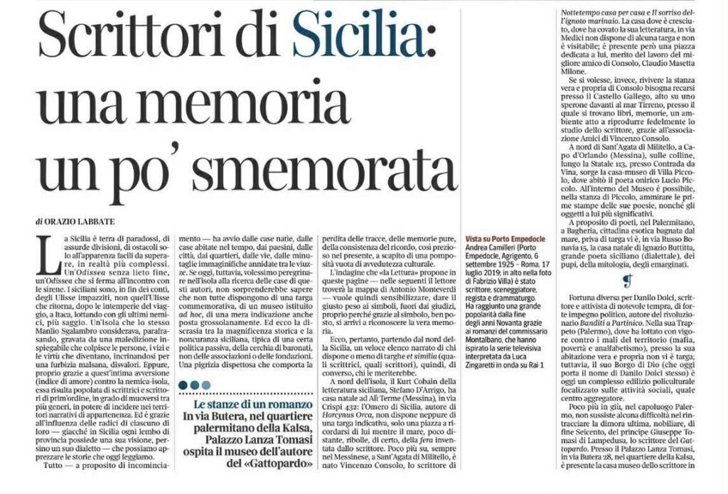 La Sicilia è terra di paradossi, di assurde divisioni, di ostacoli solo all’apparenza facili da superare, in realtà più complessi. Un’Odissea senza lieto fine, un’Odissea che si ferma all’incontro con le sirene. I siciliani sono, in fin dei conti, degli Ulisse impazziti, non quell’Ulisse che ritorna, dopo le intemperie del viaggio, a Itaca, lottando con gli ultimi nemici, più saggio. Un’isola che lo stesso Manlio Sgalambro considerava, parafrasando, gravata da una maledizione inspiegabile che colpisce le persone, i vizi e le virtù che diventano, incrinandosi per una furbizia malsana, disvalori. Ciononostante, proprio grazie a quest’intima avversione (indice di amore) contro questa nemica-isola, essa risulta ricca di scrittrici e scrittori di prim’ordine, in grado di muoversi tra più generi, in potere di incidere nei territori narrativi di appartenenza. Ed è grazie all’influenza delle radici di ciascuno di essi – giacché in Sicilia ogni lembo di provincia possiede una sua visione, persino un controverso dialetto –, che possiamo apprezzare le storie che oggi leggiamo. Tutto – a proposito di incominciamento – ha avvio dalle case natìe, dalle case abitate nel tempo, dai paesini, dalle città, dai quartieri, dalle vie, dalle minutaglie immaginifiche annidate tra le viuzze. Se oggi, tuttavia, volessimo peregrinare nell’isola alla ricerca delle case di questi, non sorprenderebbe sapere che non tutte dispongono di una targa commemorativa, di un museo eretto ad hoc, di una mera indicazione anche posta grossolanamente. Ed ecco la discrasia tra la magnificenza storica e la noncuranza siciliana, di quella politica inattiva, di quella cerchia di baronati, non delle associazioni o delle fondazioni. Una pigrizia dispettosa che comporta la perdita delle tracce, delle memorie pure, della consistenza del ricordo di valore nel presente, a scapito di una pomposità vuota di avvedutezza culturale.