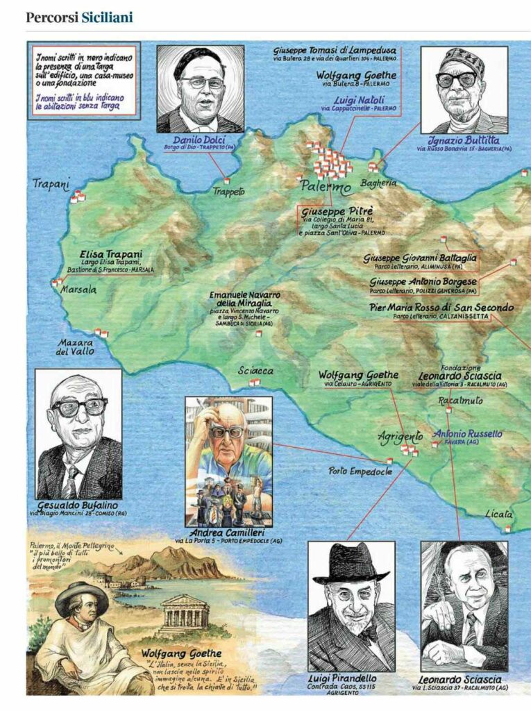 Il Premio Nobel, Luigi Pirandello, il Kafka di Sicilia, invece, dispone di una casa museo, vicina alla maestosità grecizzante della Valle dei Templi e del mar Mediterraneo, ed è sita in Contrada Caos lungo la SS115, ad Agrigento. Non per ultimo, nella vicinissima, Porto Empedocle (AG) in via La Porta 5, vi è la casa natale, della sua famiglia, di Andrea Camilleri (ricorre quest’anno il centenario della nascita dello scrittore di riferimento del giallo siciliano contemporaneo). Grazie al nome sul citofono ci si orienta, non con una targa, ma Camilleri non è privo di riconoscimenti pubblici, dalle statue dello stesso ad Agrigento, alla scalinata sempre a Porto Empedocle, ad iniziative di ogni tipo.